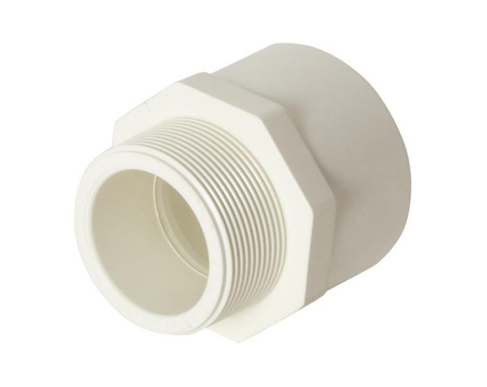 PVC pressure valve socket for use with Series 800 Pressure Pipe. Male BSP thread to solvent cement joint socket. Used for converting PVC pipe into a male BSP thread for connection to valves and other threaded pipe fittings.