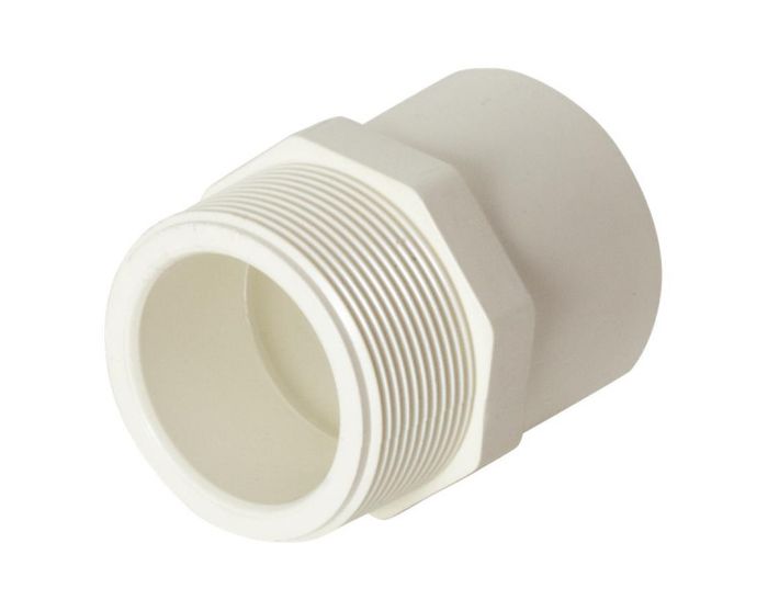Fitting with a male BSP thread one end and solvent cement joint spigot at the other end used to convert a female solvent cement joint socket fitting into a male BSP thread configuration.